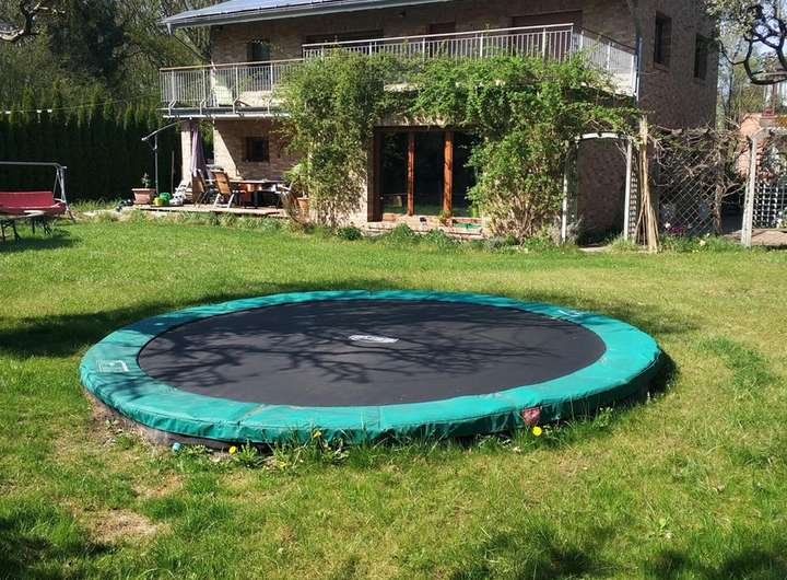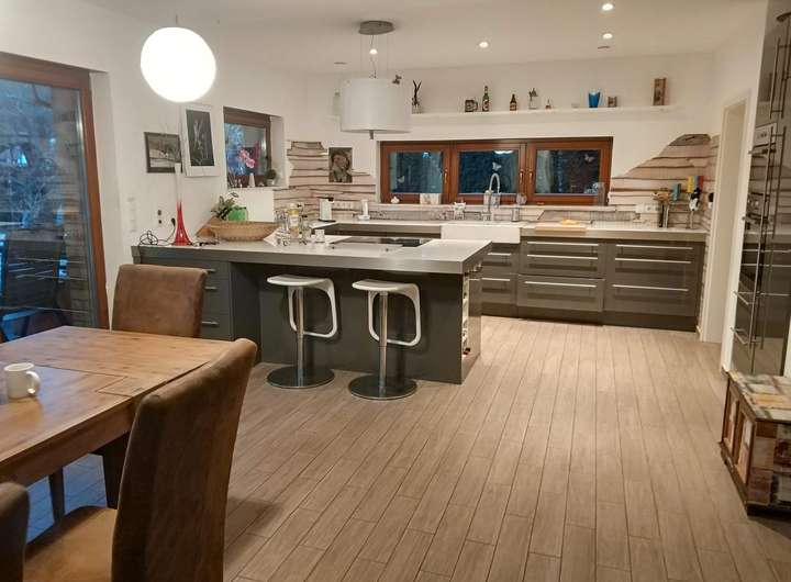 wassergeführter Kamin - Bad mit Badewanne sowie zusätzlich 2 Räume mit Toiletten mit Dusche . Einbauküche - großzügige Terassen - bodeneingelassenes Trampolin