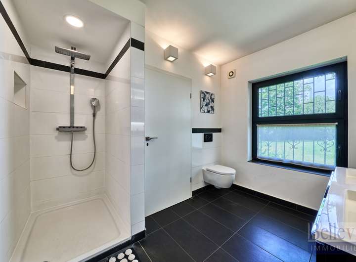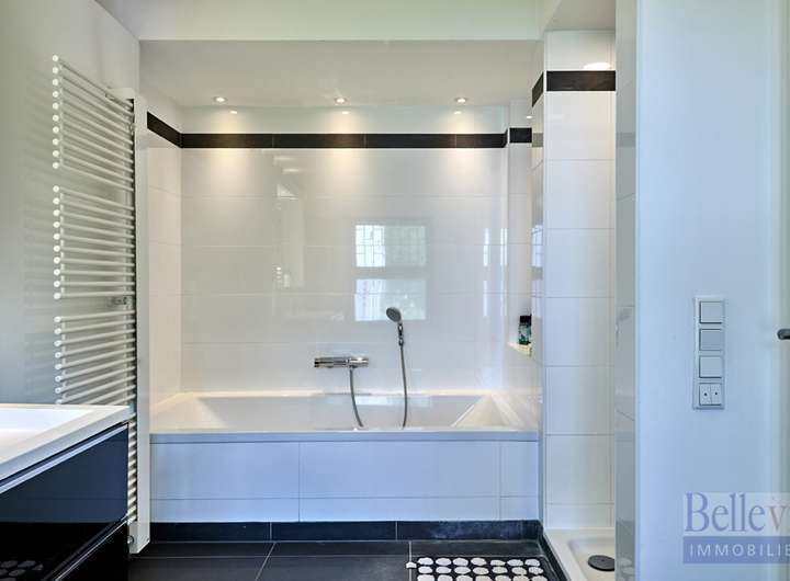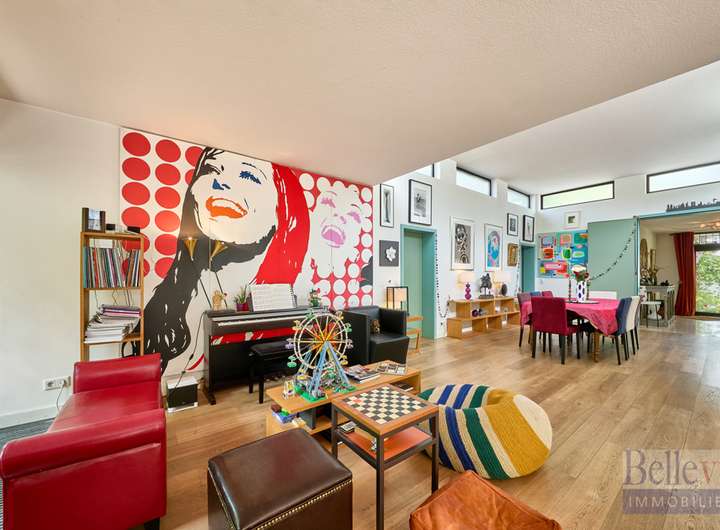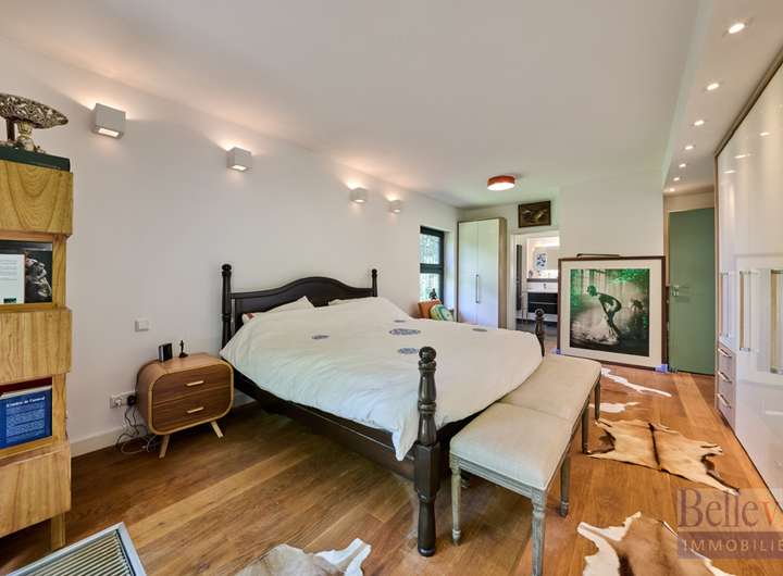 The house has an open-living concept with for example high ceilings (3.50 meters) in the living rooms. Large usage of glass in the upper areas floods the living rooms with light. The windows are floor-to-ceiling and reinforce the impression of spaciousness.