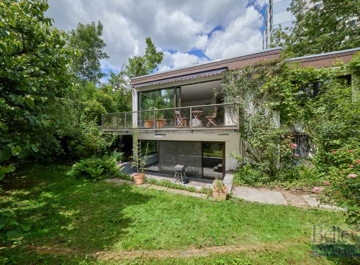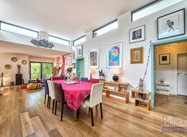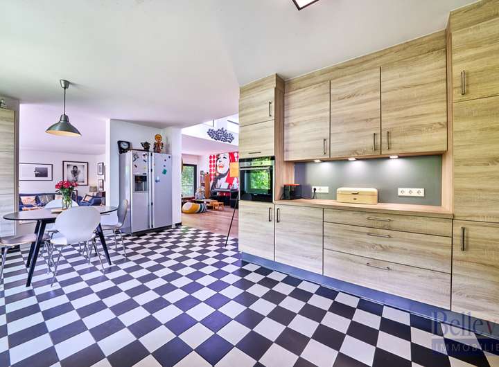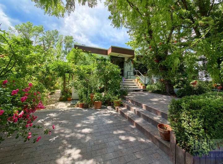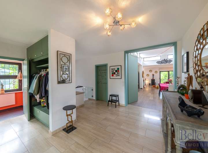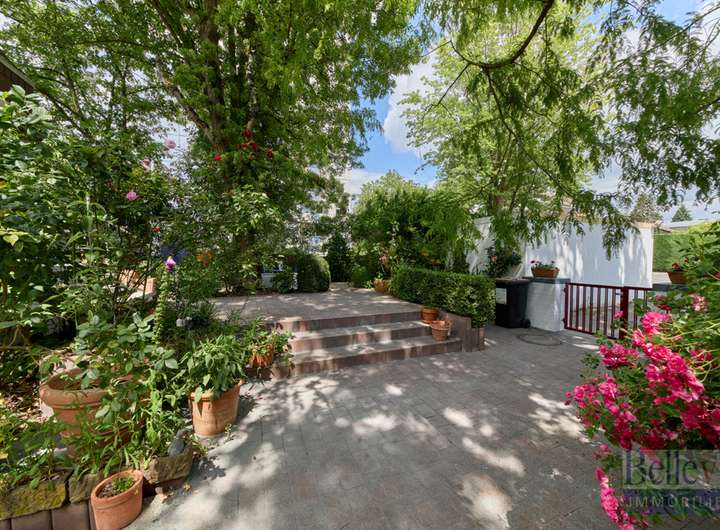 The house is entered via a spacious entrance area and immediately unfolds into the large dining area. Here you can access the open kitchen, which was completely renovated in 2015, as well as the spacious, light-flooded living room which accesses to the large, south-facing terrace. On the same floor are 3 bedrooms and 2 bathrooms. Both bathrooms were renovated in 2017. A beautiful, robust real wood parquet was laid in this area.