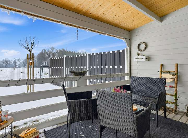 Mit einer Wohnfläche von rund 104 m², die sich auf drei Zimmer verteilt, bietet der Bungalow die ideale Mischung aus praktischem Wohnkomfort und angenehmer Großzügigkeit. Der Mittelpunkt des Hauses ist der Wohn- und Essbereich, in dem sich die hochwertige, moderne Nobilia-Küche mit Geräten von Neff harmonisch einfügt. Von hier aus eröffnet sich der Blick in den gepflegten Garten und weiter über die angrenzenden, unbebauten Felder, ein Wohngefühl, das Ruhe und Freiraum schenkt. Das Schlafzimmer ist mit einer eigenen Klimaanlage ausgestattet und sorgt damit an warmen Tagen für erholsame Nächte. Ein weiteres Zimmer kann flexibel als Büro, Gäste- oder Kinderzimmer genutzt werden und passt sich somit dem jeweiligen Lebensmodell an. Das moderne Vollbad ist hochwertig ausgestattet, zeitlos gestaltet und alltagstauglich, es entspricht den Erwartungen an ein Haus jüngsten Baujahrs.