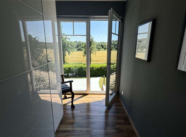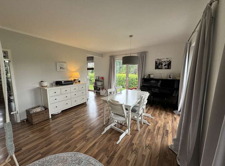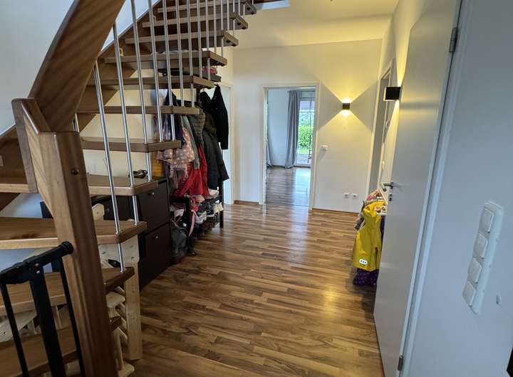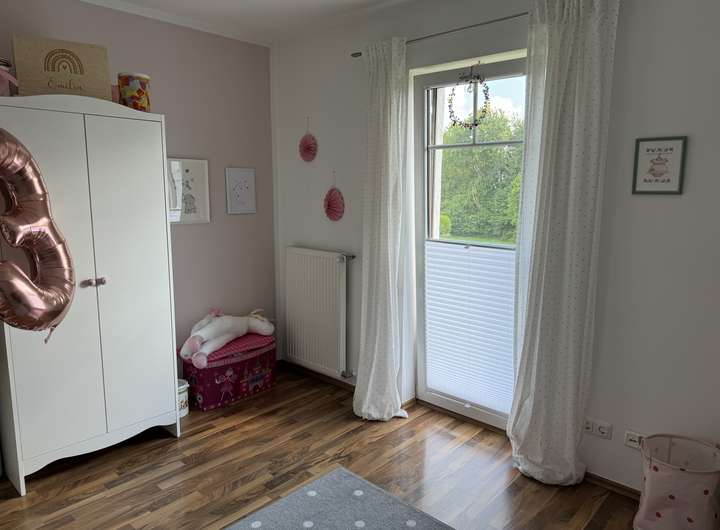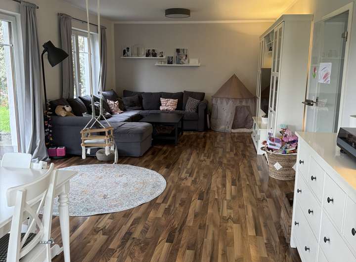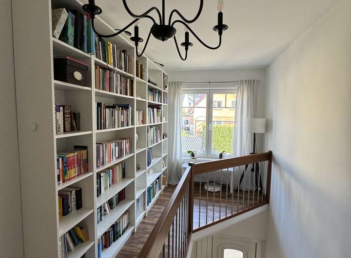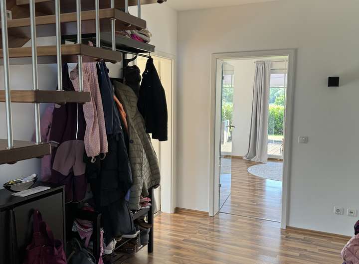 Ein paar Möbel (wie moderner, hochwertiger Pax-Einbauschrank in der Ankleide, Bücherwand im oberen Flur sowie Garderobenmöbel im unteren Flur, hochwertige Flurbeleuchtung, moderne Landhausstil Schrankwand im Wohnzimmer, großes Ecksofa, Loungemöbel der Veranda mit Auflagen, Holzplissees und Plissees) sind im Mietpreis enthalten.