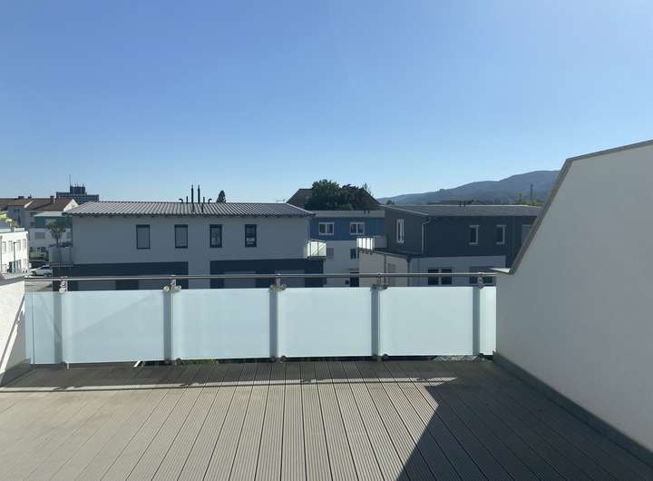 Ein besonderes Merkmal des Hauses ist die große Dachterrasse mit weitem Ausblick bis zum Hambacher Schloss.