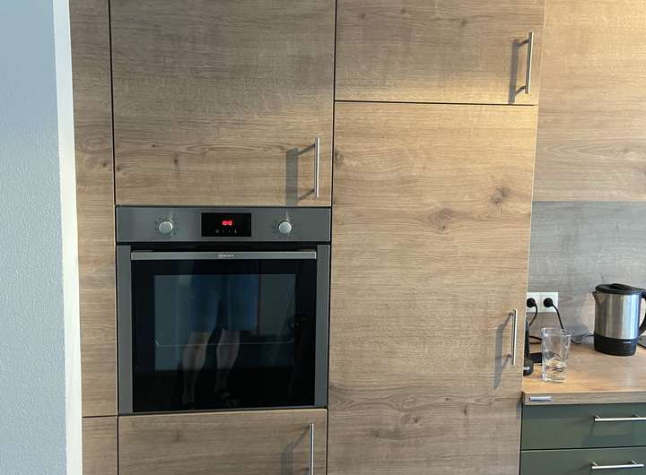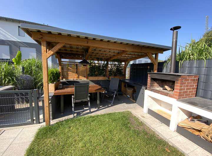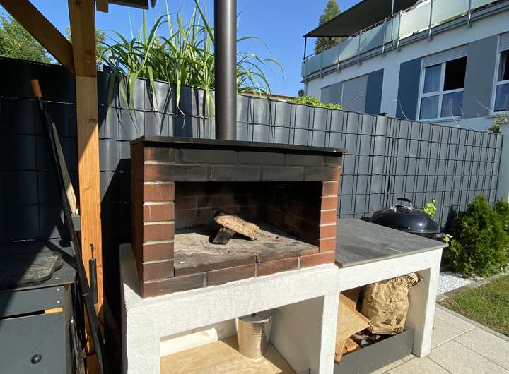 Zum Haus gehört ein etwa 200 m² großer Garten mit einer Pergula und einem gemauerten Pizzaofen. Eine moderne Einbauküche ist vorhanden und im Mietpreis enthalten. Ebenfalls im Mietpreis inbegriffen sind zwei Stellplätze.