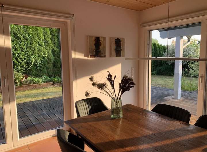 Bei dem Objekt handelt es sich um ein top-gepflegtes, vollständig möbliertes Einfamilienhaus, das über einen besonderen Charme verfügt und aufgrund seines durchdachten Grundrisses überzeugt: Über einen Flur mit einer sich anschießendem Gäste-Toilette gelangt man in das großzügige Wohn-Esszimmer. Diesem schließt sich eine Einbauküche und eine kleine Speisekammer an. Am großen Esstisch finden bis zu 10 Personen Platz. Über eine Dreh-Schiebekipptür gelangt man auf die 54 m² große, teils überdachte Süd-West-Terrasse, von der aus man den wunderbar eingewachsenen Garten genießen kann. Die Holzterrasse ist mit einem schönen Gartentisch ausgestattet und bietet ausreichend Platz für Grillabende mit Freunden.