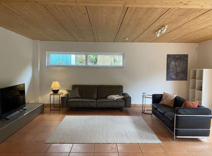The property is a well-maintained, fully furnished detached house, which has a special charm and convinces due to its well thought-out floor plan: Via a hallway with an adjoining guest toilet you enter the spacious living-dining room. This is followed by a fitted kitchen and a small pantry. The large dining table can seat up to 10 people. Through a turn-slide-tilt door you reach the 54 m² large, partly covered south-west terrace, from which you can enjoy the wonderfully overgrown garden. The wooden terrace is equipped with a nice garden table and offers enough space for barbecue evenings with friends. Upstairs there are three bedrooms and a designer bathroom with bathtub and shower. All rooms on the upper floor have parquet flooring. The largest room on the upper floor has 21 m² and can be used variably. In the basement living room there are three rooms: from the office and guest room you can enjoy the view into a planted atrium, the second room can be used as a hobby room. The third room is a utility room with a Miele washer and dryer, a walk-in shower and a separate toilet. In the double garage there is space for two cars as well as bicycles, in front of the garage more vehicles can be parked. Furthermore, a small shed is available to store additional equipment.