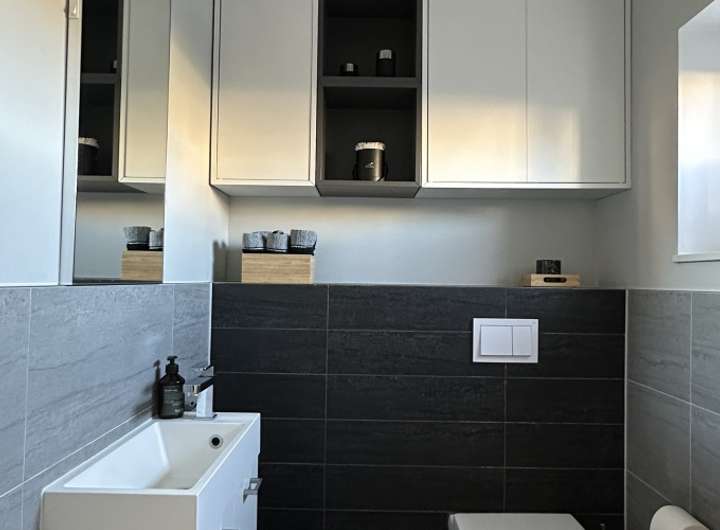 - schickes Gäste-WC mit Spiegel, Waschtischanlage und Wandschränken
