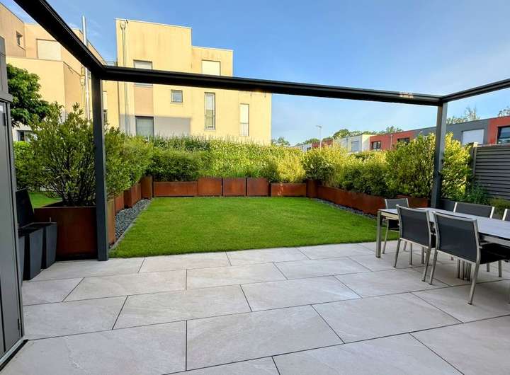 - pflegeleichter Garten mit großformatig gefliester Sonnenterrasse und ausreichend Spielmöglichkeiten für Kinder