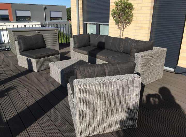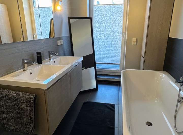 :- riesige Sonnendachterrasse (ca. 30 qm) mit farblich abgestimmten WPC-Dielen- großzügiges Vollbad mit großer begehbarer Regendusche, Wandnische, großem Spiegelschrank, Waschtischunterschrank und Designwanne (halb freistehend)