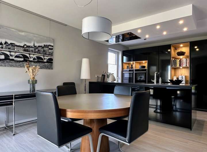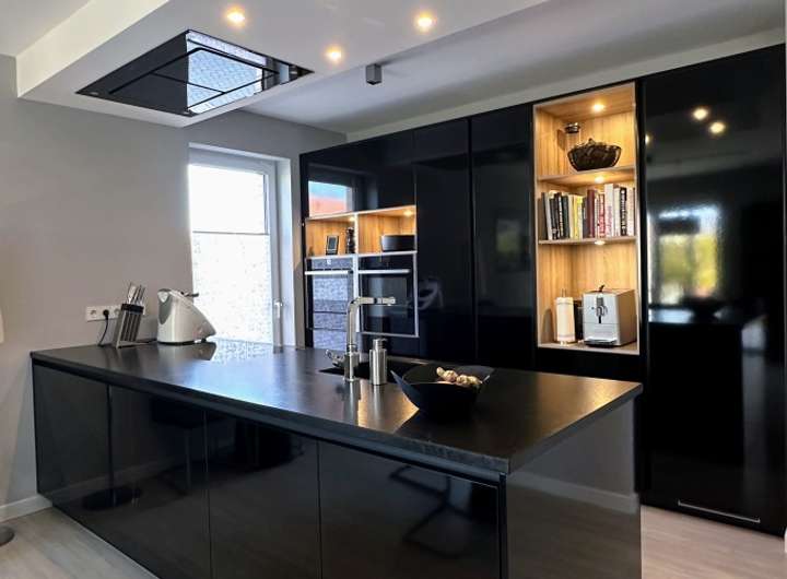 - moderne grifflose Designerküche mit NEFF/Bosch Elektrogeräten in schwarz Hochglanz und leistungsstarkem Abluft-Dunstabzug