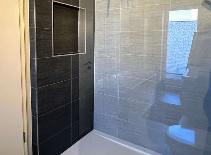 - modernes Duschbad mit Regenbrause, Spiegelschrank, Waschtischunterschrank und praktischer Nische