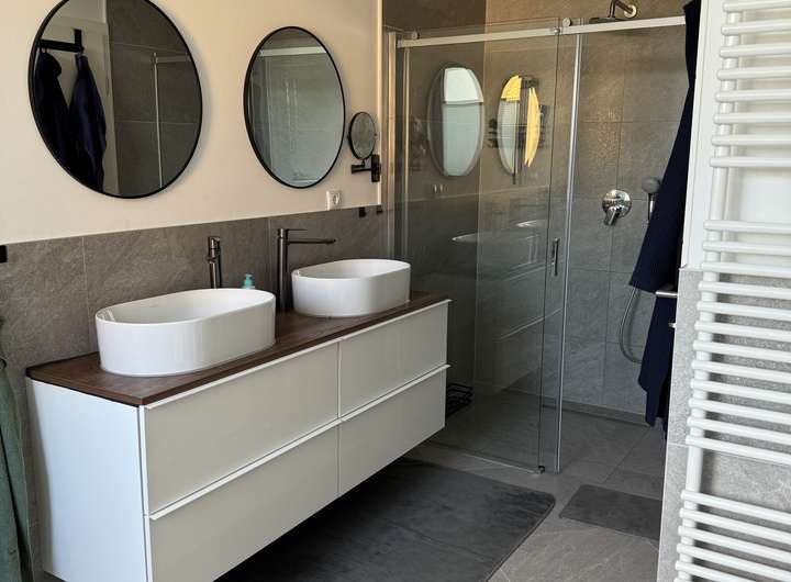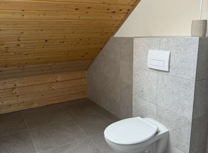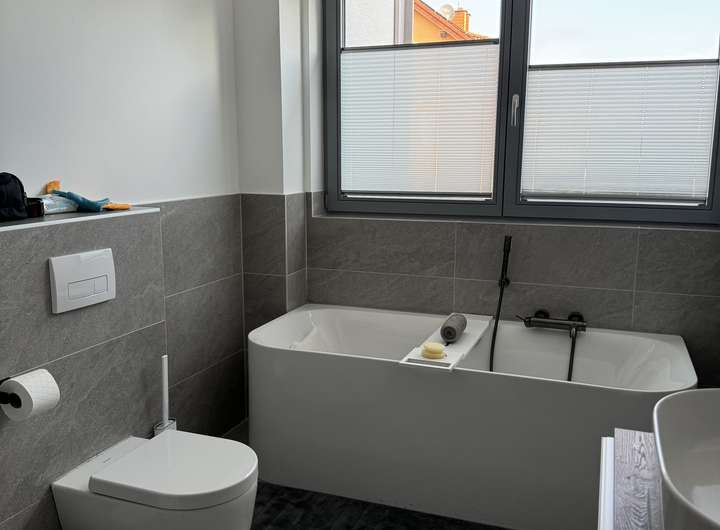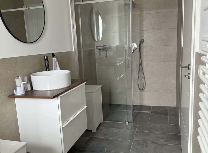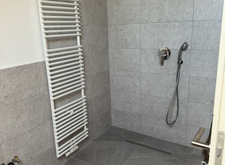 Direkt vom Eingangsbereich aus liegt auf der linken Seite ein Badezimmer mit Dusche, WC und Waschbecken, inklusive Anschluss für Waschmaschine und Trockner – ideal für den Alltag.
