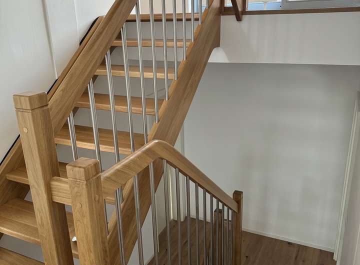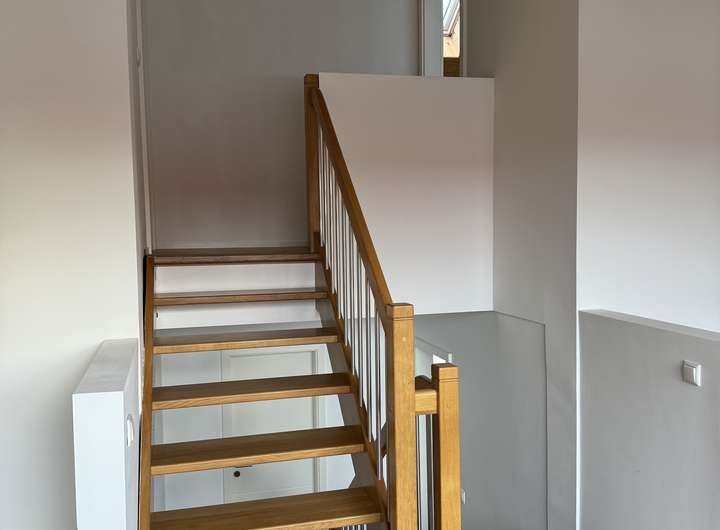 Über die Treppe nach oben erreicht man die Kinder- bzw. Arbeitszimmer, die sich jeweils links und rechts befinden. Eine weitere Etage höher liegt das Schlafzimmer mit angrenzendem Badezimmer, das einen privaten Rückzugsbereich bildet.