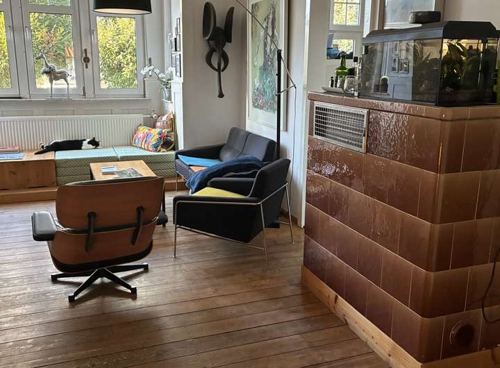 Schöne Dielenböden und alter Kachelofen im Wohnzimmer*