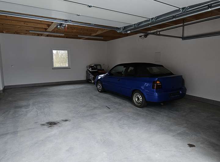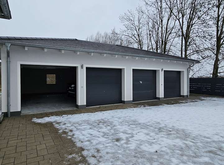 Zur Doppelhaushälfte gehören zwei große Doppelgaragen mit viel Abstellfläche.