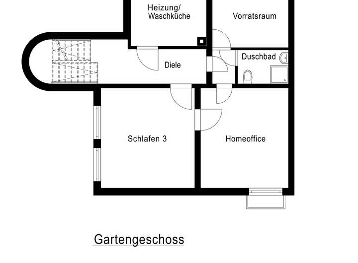 Im Gartengeschoss ist ein weiteres Kinder-, Schlaf- bzw. Gästezimmer zu finden sowie ein Homeoffice und ein Duschbad. Außerdem befinden sich in diesem Geschoss ein Heizungsraum mit einer Waschküche sowie ein Vorratsraum.