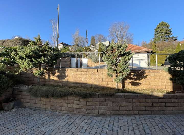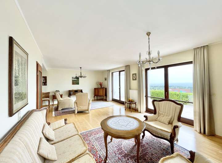 - lichtdurchflutetes geräumiges Wohnzimmer mit Fernblick und Zugang zur Südterrasse und in den aufwendig terrassenförmig angelegten Garten