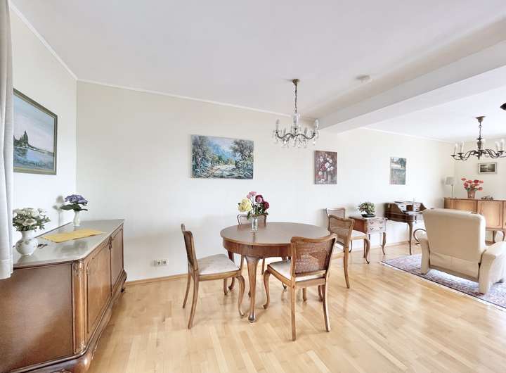 - an das Wohnzimmer angrenzender Essbereich, Bodenbelag Parkett