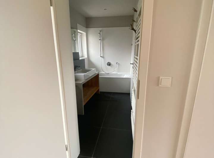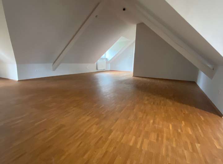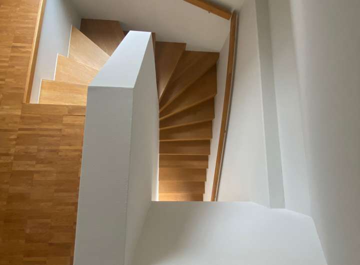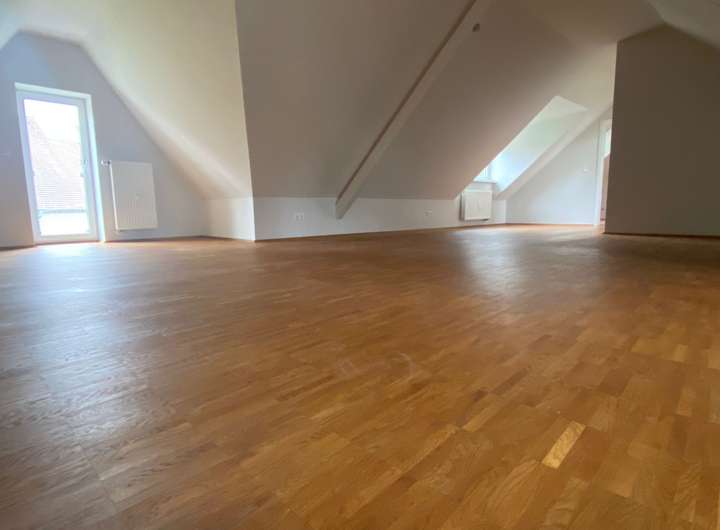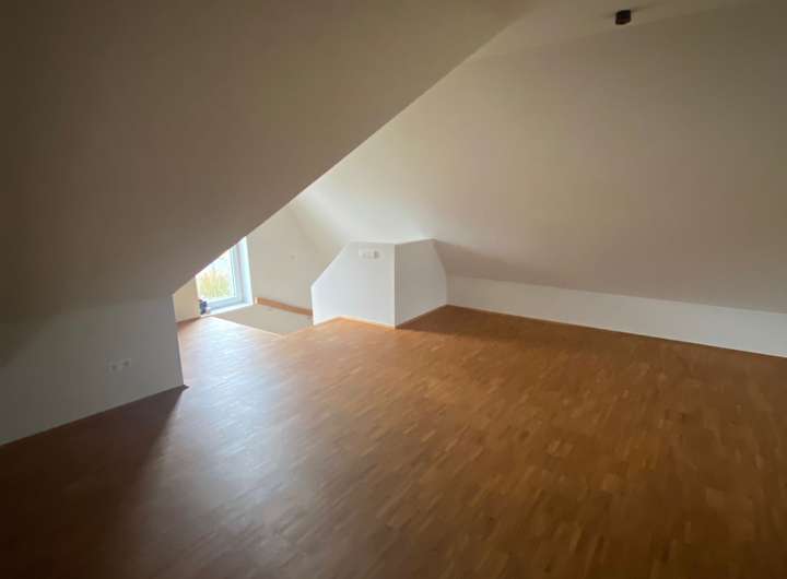 Über drei Ausgänge im Süden und Westen gelangt man auf die zwei Terrassen und in den dazugehörigen Garten. Im Obergeschoss befindet sich ein weiteres Schlafzimmer und Bad mit Dusche, sowie ein großer offener Bereich, der flexibel genutzt werden kann. Alle Wohnräume sind mit hochwertigem Parkett ausgestattet.