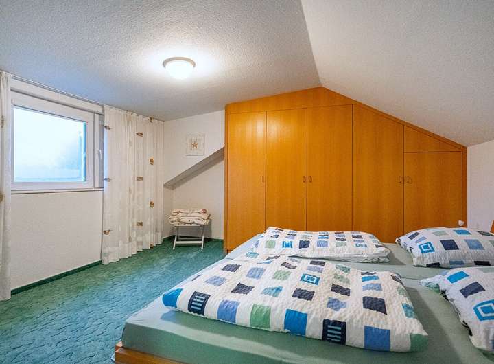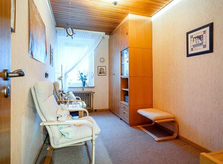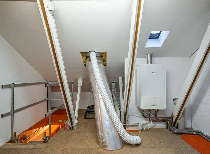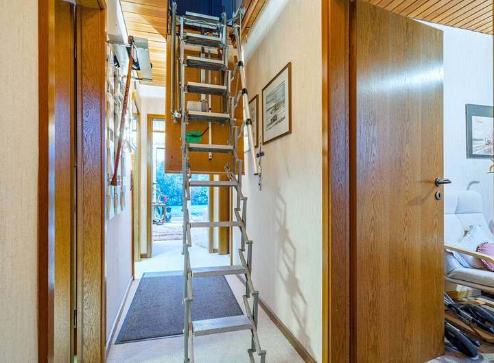 Das Obergeschoss erreichen Sie über eine elektrisch ausfahrbare Treppe. Dort befindet sich ein weiteres Schlafzimmer sowie ein kleiner Dachbodenbereich mit der modernen Gas-Brennwerttherme (Bj. 2014). Die Fenster wurden vor etwa zehn Jahren erneuert und befinden sich in sehr gutem Zustand.