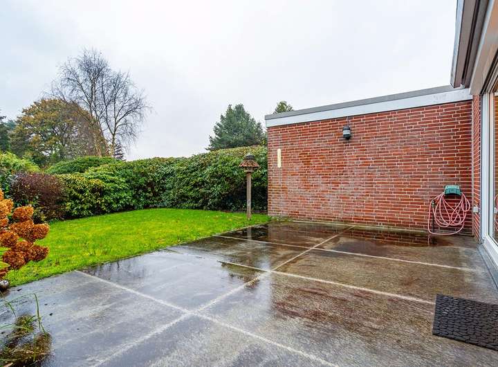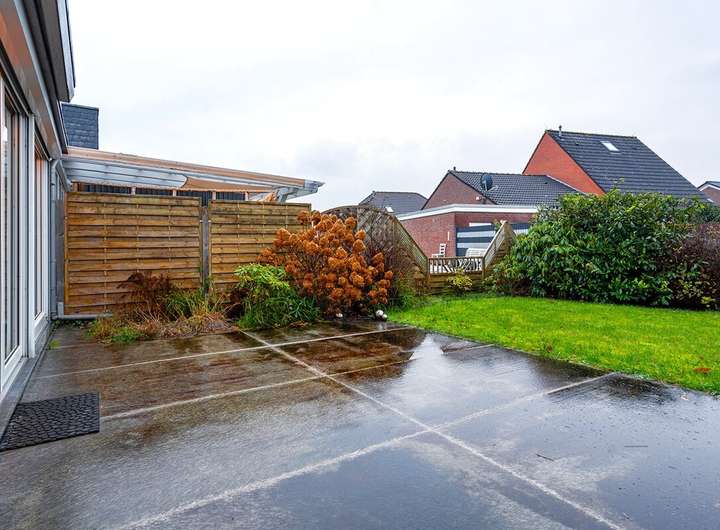 Der Außenbereich bietet eine großzügige Terrasse mit hochwertigen, großformatigen Fliesen und elektrischer Markise. Der Garten ist pflegeleicht und angenehm privat. Ein zusätzlicher Außenabstellraum schafft Platz für Fahrräder, Mülltonnen oder Gartengeräte.