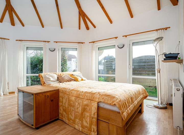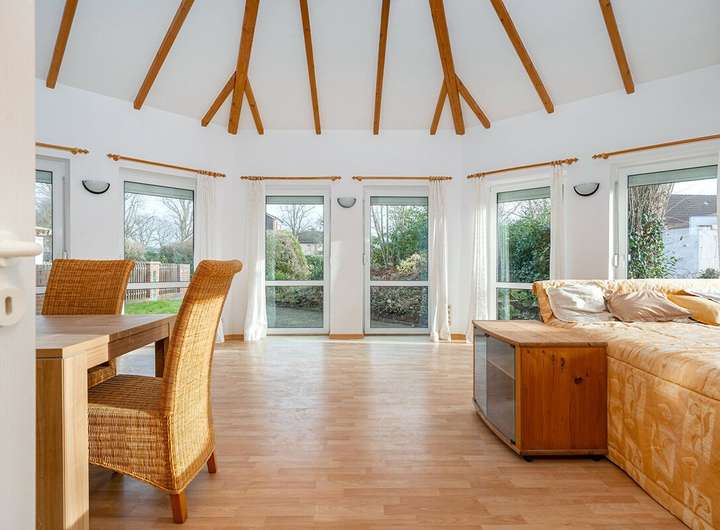 Der Pavillon (Baujahr ca. 2016) verfügt über ca. 45 m² Wohnfläche und punktet mit seiner lichtdurchfluteten Architektur: Zahlreiche bodentiefe Fensterelemente, ein offen gestalteter Wohn-/Ess-/Kochbereich und ein angeschlossener Schlafbereich schaffen ein großzügiges Loft-Gefühl, das sich bei Bedarf mit Leichtbauwänden in separate Räume gliedern lässt. Ergänzt wird diese Einheit durch ein modernes Duschbad, ein separates WC, eine Einbauküche, eine eigene Gas-Brennwerttherme (Junkers, Baujahr ca. 2016), separate Elektrik mit eigenem Zähler sowie eine Terrasse mit Blick ins Grüne.