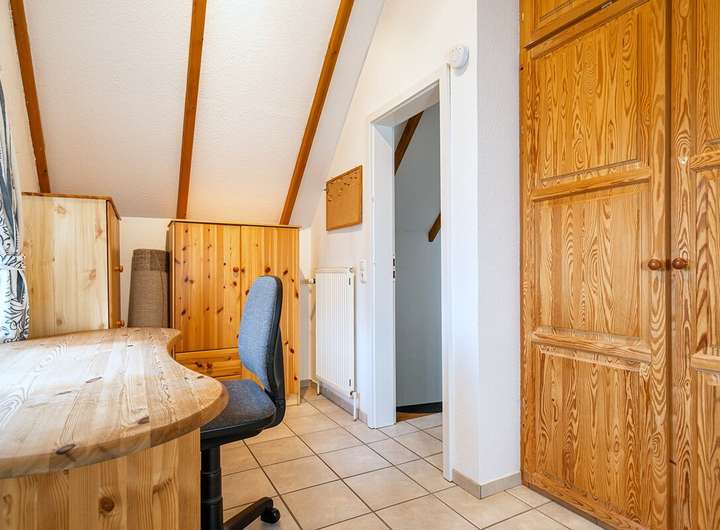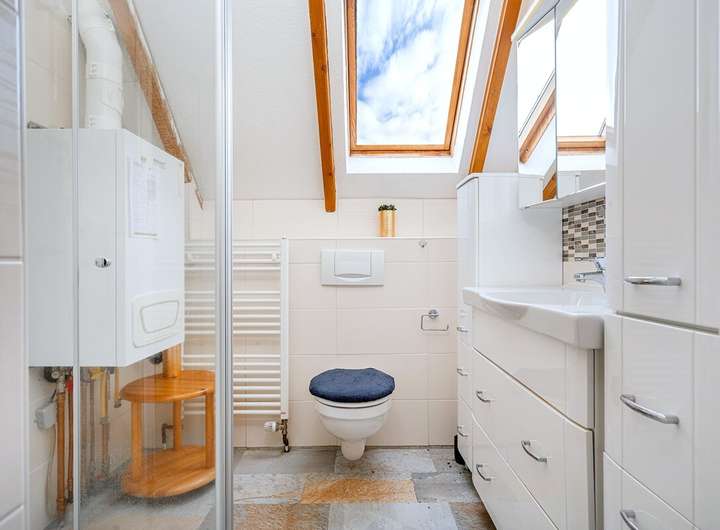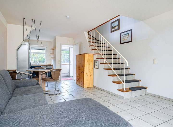 Das Reihenendhaus bietet auf ca. 75 m² eine charmante, sehr praktische Aufteilung: Im Erdgeschoss liegen der helle Wohn-/Essbereich mit Kaminofen, die Küche und ein Gäste-WC. Im Dachgeschoss befinden sich ein Schlafzimmer, ein weiteres Zimmer sowie ein Duschbad mit Dachfenster, in dem auch die Gas-Brennwerttherme (Brötje, Baujahr 2014) und der Waschmaschinenanschluss untergebracht sind. Ein echtes Highlight ist der Anbau mit Sauna, Dusche und direktem Zugang in den Garten, ergänzt um einen separaten Hauswirtschafts-/Abstellraum mit eigenem Eingang von außen – ideal für Feriengäste, Hobby oder Stauraum.