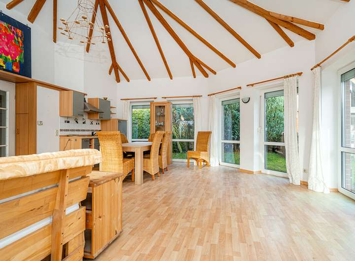 •Pavillon in massiver Bauweise mit vielen bodentiefen Fenstern