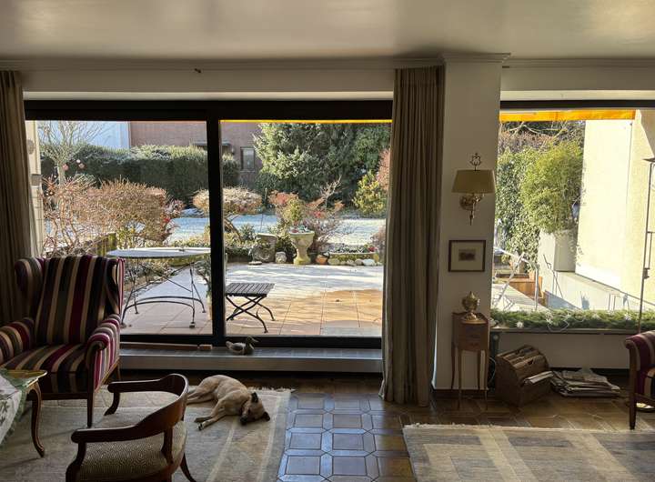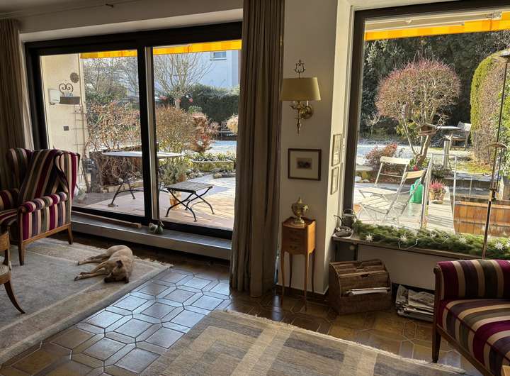 • großzügiger Wohn-und Essbereich mit bodentiefem Fenster und Blick in den Garten