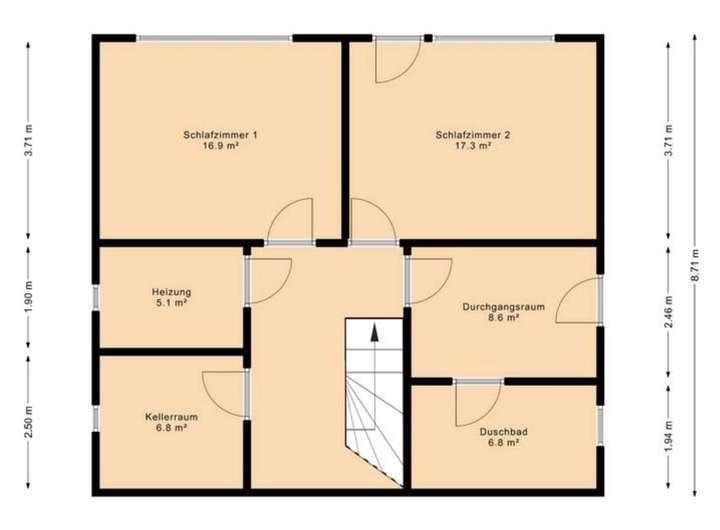 Die Räume verteilen sich auf zwei Stockwerke. Da das Grundstück leicht abschüssig ist, ist das Untergeschoss auf der straßenabgewandten Seite ebenerdig, und die dort gelegenen Schlafzimmer besitzen große Fenster.