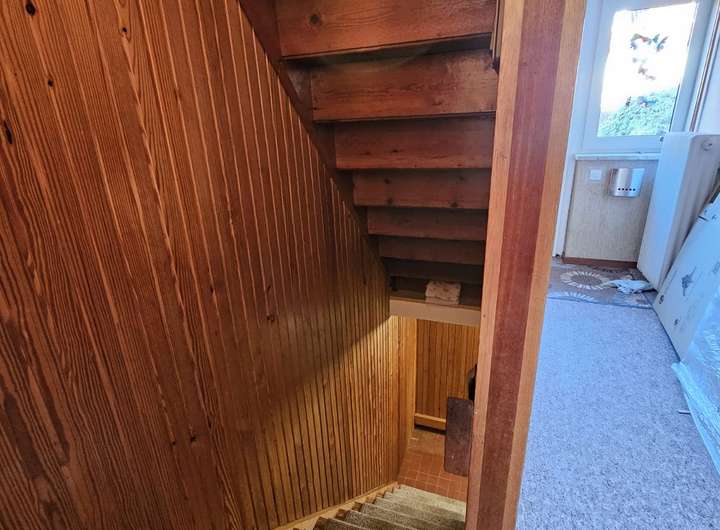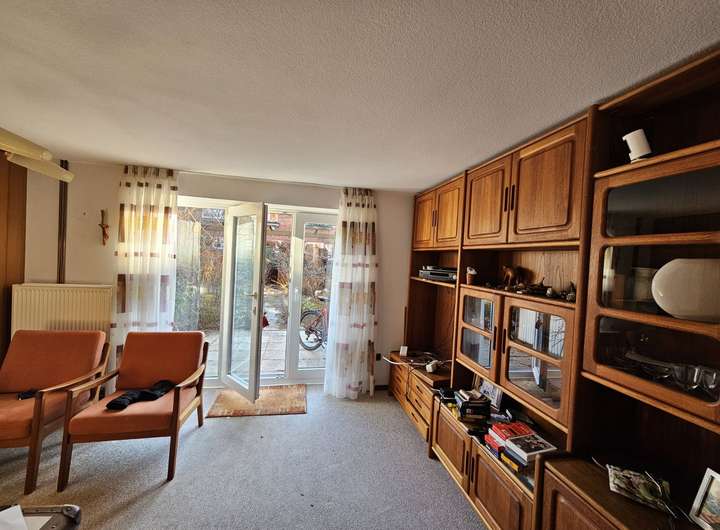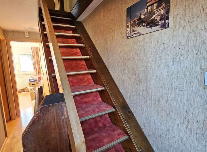 Das Erdgeschoss bietet aktuell eine klassische Aufteilung in Küche und Wohnzimmer, lässt sich jedoch hervorragend zu einem offenen Wohn-, Ess- und Familienbereich umgestalten – ideal für modernes Familienleben. Vom Wohnzimmer aus gelangen Sie direkt auf die sonnige Terrasse und in den Garten.