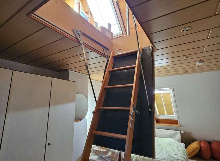 Im Obergeschoss unterstreicht ein hochwertiger Holzboden den wohnlichen Charakter. Hier befinden sich ein Elternschlafzimmer sowie ein Arbeits- oder Kinderzimmer. Zusätzlich wurde eine separate WC-Kabine mit Waschbecken integriert – der Einbau eines vollwertigen Badezimmers ist möglich und bietet weiteres Entwicklungspotenzial für wachsende Familien.