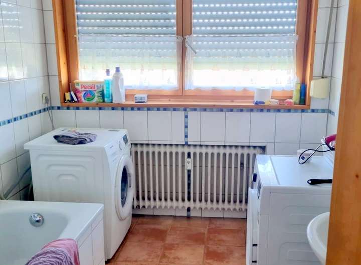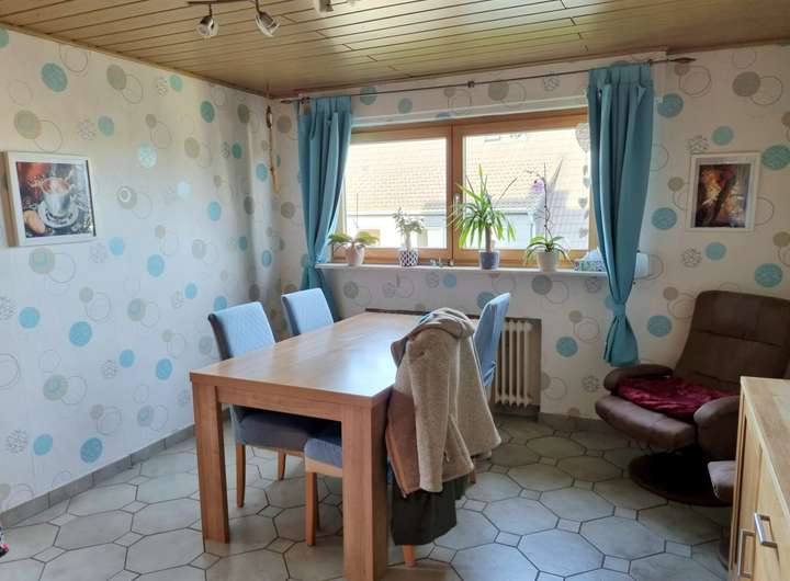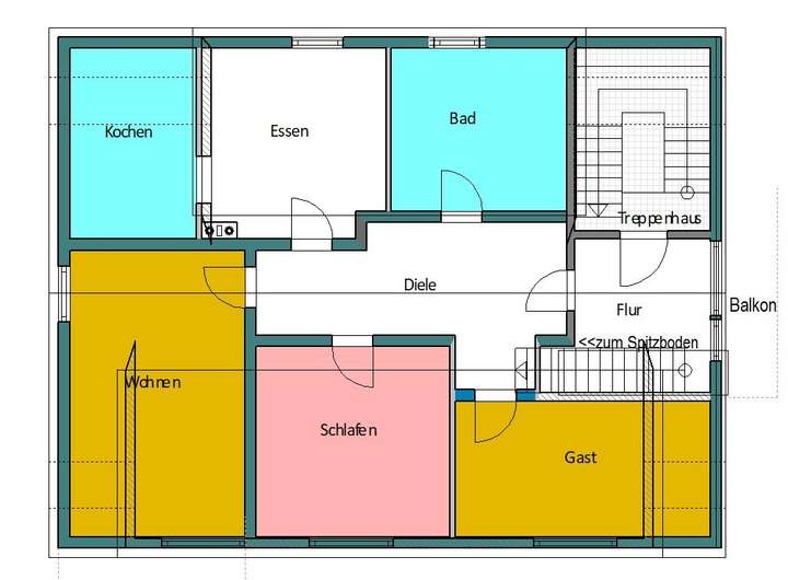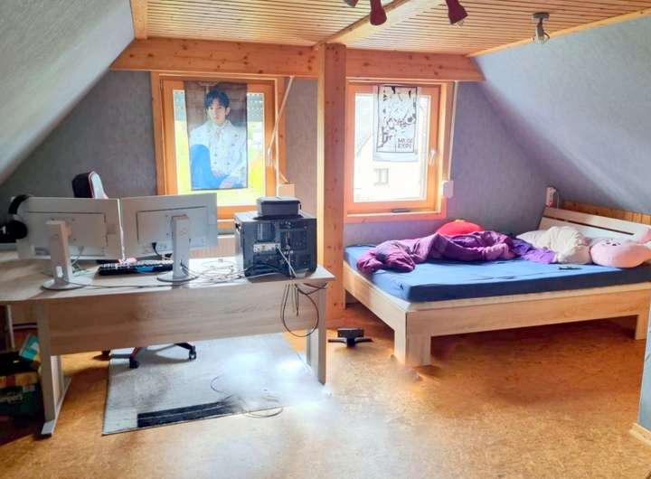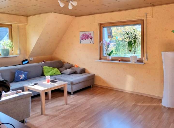 mit drei Zimmern, Küche, Bad und Abstellkammer, sowie abgetrennten Zugang zum ausgebauten Spitzboden mit zwei Zimmer und einem Duschbad.