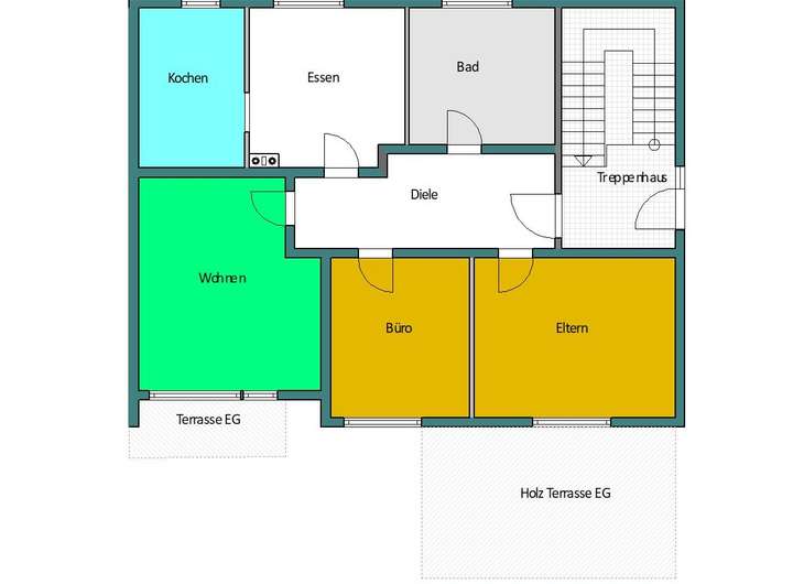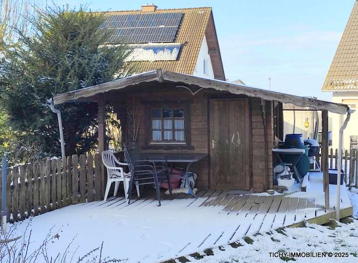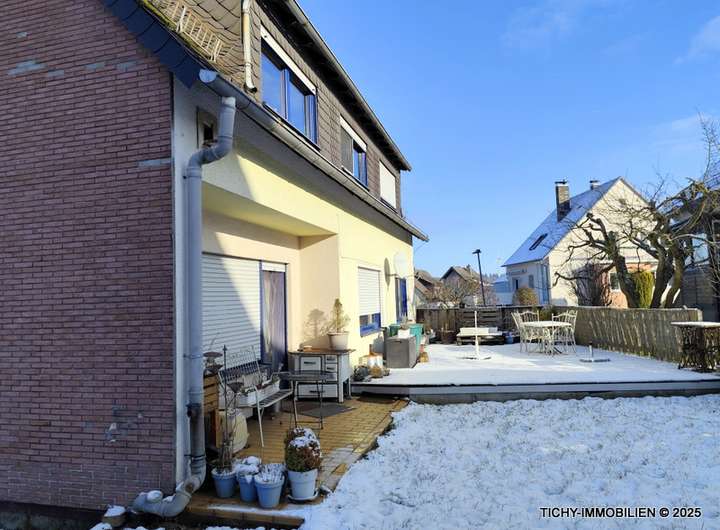 Das Grundstück mit 492 m² ist in 2 Bereiche für die zwei Wohneinheiten aufgeteilt. Die EG-Wohnung verfügt über eine teilüberdachte Terrasse und zusätzlich großer Holzterrasse