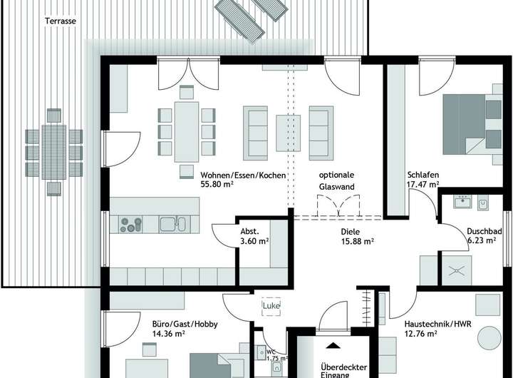 Freuen Sie sich auf eine gehobene Ausstattung, die keine Wünsche offenlässt. Der Bungalow ist wahlweise mit Fliesen oder nach Wunsch gestaltbaren Bodenbelägen ausgestattet - beides Optionen, die sowohl optisch ansprechend als auch pflegeleicht sind. Die innovative Wärmepumpe sorgt für effizientes und umweltfreundliches Heizen im Einklang mit dem KFW40 Standard, was nicht nur gut für die Umwelt, sondern auch für Ihren Geldbeutel ist.