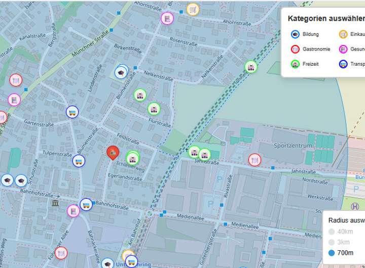 Für Familien besonders attraktiv sind die zahlreichen Bildungs- und Betreuungseinrichtungen, die in nur wenigen Gehminuten erreichbar sind. Kindergärten wie der Kindergarten Blumenstraße und die Grundschule Unterföhring liegen nur etwa drei bis fünf Minuten zu Fuß entfernt und sind bequem über nahegelegene Busstationen wie „Unterföhring, Tulpenstraße“ in zwei Minuten erreichbar. Ergänzt wird das Angebot durch die Volkshochschule, die vielfältige Lernmöglichkeiten für alle Altersgruppen bietet. Die medizinische Versorgung ist mit Apotheken wie der Feringa Apotheke und mehreren Facharztpraxen in unmittelbarer Nähe hervorragend gewährleistet, sodass Familien jederzeit auf kompetente Betreuung vertrauen können. Die fußläufig erreichbaren Parks und Spielplätze, darunter der Tunnelweg in nur sieben Minuten zu Fuß, laden zu entspannenden Stunden im Grünen und aktiver Freizeitgestaltung ein. Für das leibliche Wohl sorgen charmante Restaurants und Cafés wie „Hasu“ und das „Jugendcafé cafezinho“, die in fünf bis sechs Minuten zu Fuß erreichbar sind und zum geselligen Beisammensein einladen.