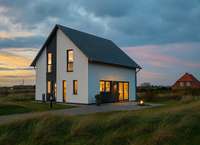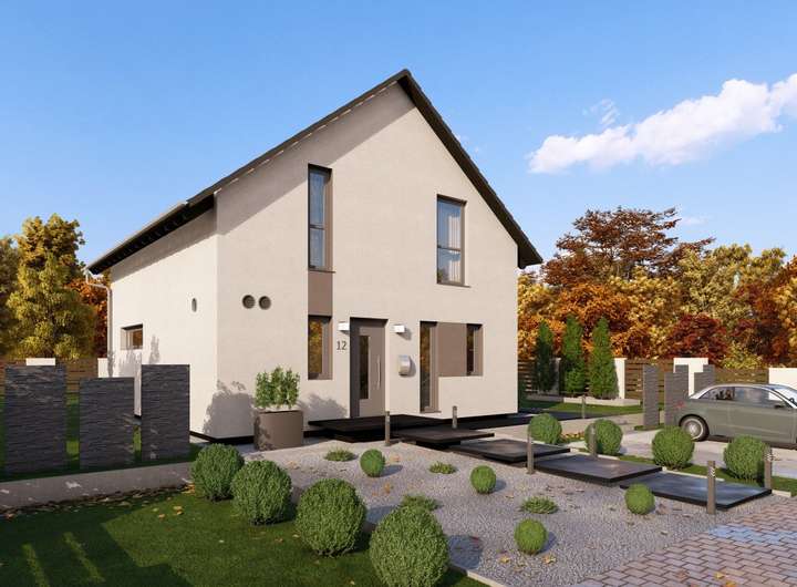 Zeitlose Eleganz von außen, großzügiger Raum und ein besonderes Raumgefühl von innen - das zeichnet unser Design 10 aus. Unter dem Satteldach erwarten etwa 135 m² auf zwei Ebenen darauf, bezogen und mit Leben gefüllt zu werden. Im Erdgeschoss steht Offenheit im Mittelpunkt: Der großzügige Wohn-Ess-Koch-Bereich erstreckt sich fast über die gesamte Ebene und wird lediglich durch die zentral platzierte Treppe von der Diele getrennt. Das Ergebnis ist ein heller, einladender und großzügiger Raum, ideal zum Wohlfühlen und Zusammenkommen. Im Eingangsbereich befinden sich zudem ein kleines Gäste-WC sowie ein großer Hauswirtschaftsraum. Über die mittig platzierte Treppe gelangt man ins Obergeschoss. Hier gibt es ausreichend Platz für Eltern und bis zu zwei Kinder. Die Eltern genießen ein großzügig gestaltetes Schlafzimmer mit separatem Ankleideraum, während zwei große Kinderzimmer ebenfalls keine Wünsche offenlassen. Das Raumangebot in der oberen Etage wird durch ein geräumiges Badezimmer mit Dusche, Badewanne und WC abgerundet.