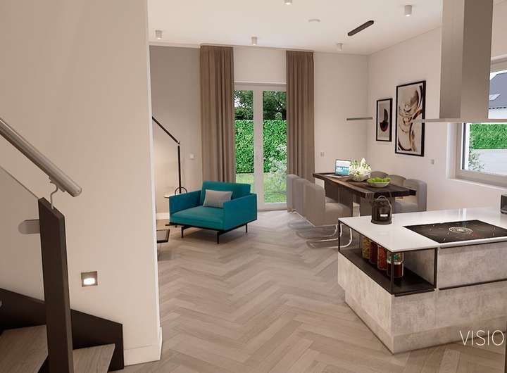 Klein, aber fein - so präsentiert sich unser Doppelhaus 07. Unter dem stilvollen Satteldach befinden sich zwei separate Wohneinheiten, die sich auf zwei Etagen verteilen. Diese bieten ausreichend Platz und Komfort für Singles, Paare oder kleine Familien. Im Erdgeschoss besticht ein großzügig gestalteter Wohn-Ess-Bereich mit einer integrierten Küchenzeile. Von der Küche aus gelangt man direkt in einen großen und praktischen Hauswirtschaftsraum, der zahlreiche Staumöglichkeiten bietet. Ein Gäste-WC und eine Garderobe sind ebenfalls auf dieser Etage vorhanden. Die halbgewendelte Treppe im Eingangsbereich trennt elegant den Nutz- vom Wohnbereich. Im Dachgeschoss stehen den zukünftigen Eigenheimbesitzern etwa 50 m² Wohnfläche zur Verfügung, die dank der durchdachten Raumaufteilung keine Wünsche offenlassen. Das Elternschlafzimmer sowie das Kinderzimmer strahlen durch die Dachschrägen besondere Gemütlichkeit aus und bieten dennoch genügend Platz für Möbel, Erholung, Entspannung und Spiel. Auch auf dieser Ebene befindet sich ein großzügiges Tageslichtbad mit Badewanne, Dusche und WC. Hier gilt: maximaler Wohnkomfort auf kleiner Fläche.