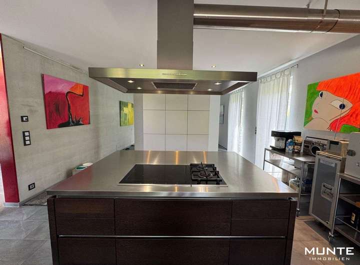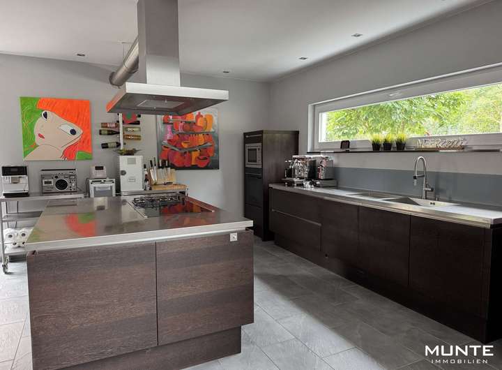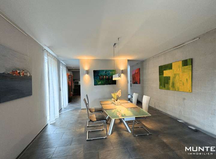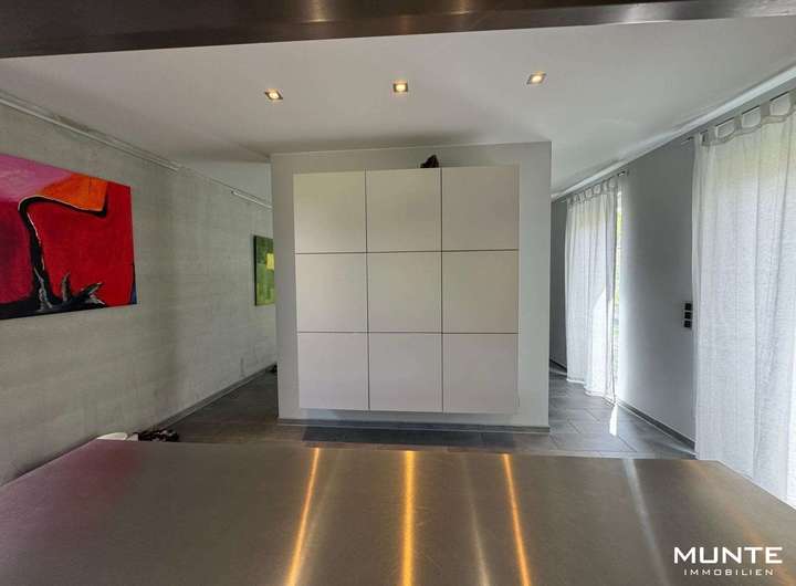 Rechts gelangen Sie in der offen gestalteten Küche mit angrenzendem Essbereich. Die Einbauküche in Holzoptik ist nicht nur modern und funktional, sondern bietet durch die großzügigen Fenster eine helle Atmosphäre. Dank des durchdachten Grundrisses gelangen Sie direkt ins angrenzende Esszimmer. Die stilvolle Sichtbetonwand sorgt hier für einen besonderen architektonischen Akzent, während ausreichend Platz für einen großen Esstisch gesellige Abende mit Familie und Freunden ermöglicht. Von hier aus führt eine Tür auf eine der beiden Terrassen mit Gartenblick.