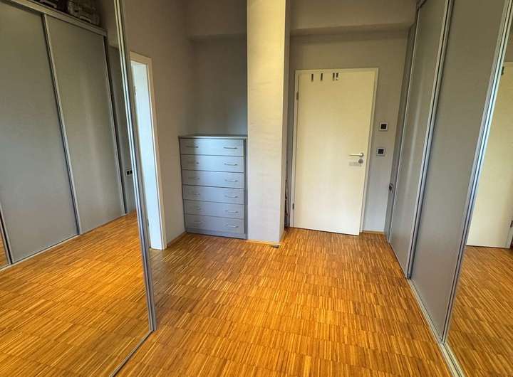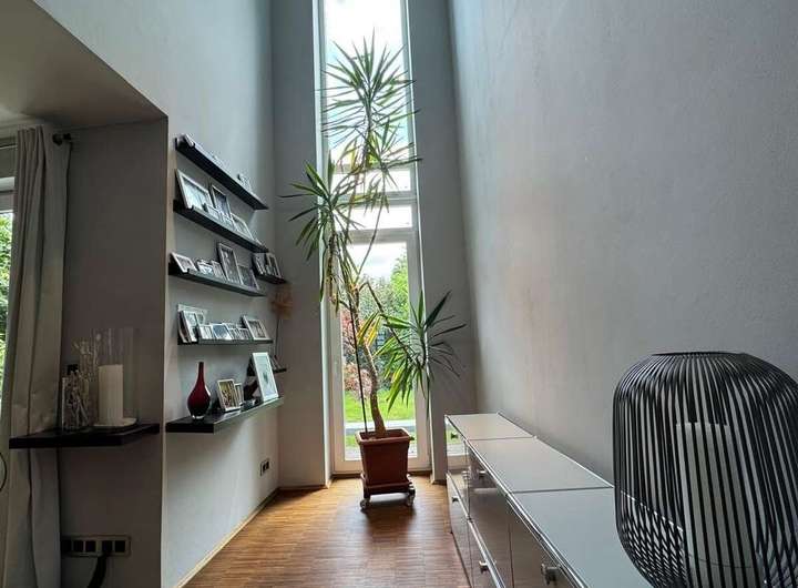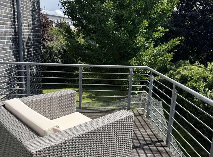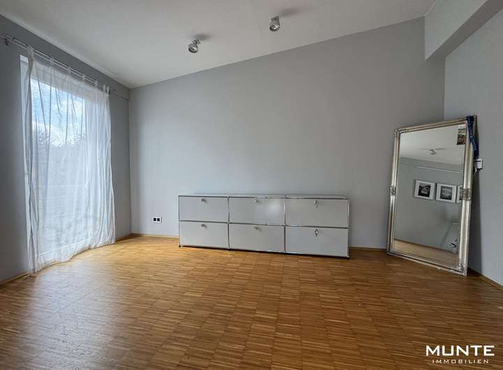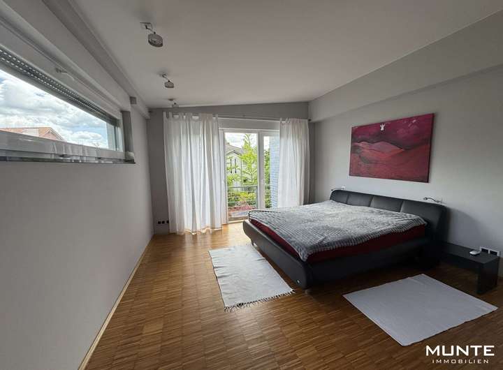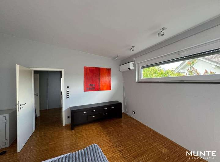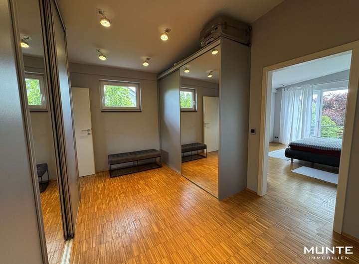 Über die stilvolle Treppe gelangen Sie zur Galerie im Obergeschoss, von der aus allen weiteren Räumen erreichbar sind. Der Elternbereich umfasst ein Schlafzimmer, ein großzügiges Ankleidezimmer sowie ein Badezimmer mit Dusche und Badewanne. Im zweiten Bereich befinden sich zwei weitere, gleichwertige Zimmer mit vielfältigen Nutzungsmöglichkeiten – als Kinder-, Arbeits- oder Gästezimmer. Eines der Zimmer bietet Zugang zu einem sonnigen Balkon mit Blick ins Grüne – perfekt für entspannte Stunden im Freien.