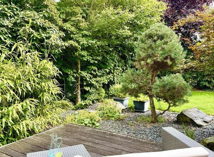 Bereits beim ersten Blick auf die Vorderseite des Hauses fallen die Garage und der liebevoll angelegte Vorgarten ins Auge. Die Garage bietet nicht nur Platz für ein Fahrzeug, sondern eignet sich auch ideal als Stauraum für Gartengeräte und mehr. Ein Teil des Vorgartens ist eingezäunt und mit einem Tor versehen – von hier aus gelangen Sie direkt in den pflegeleichten, grünen Garten.
