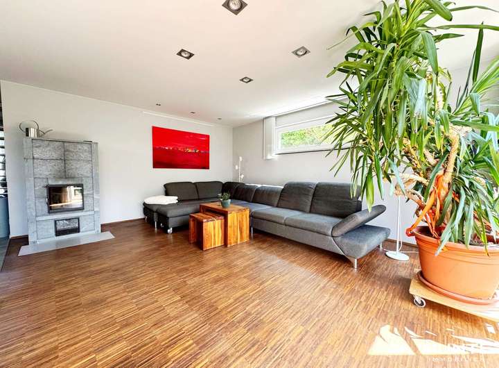 Das lichtdurchflutete Wohnzimmer erreichen Sie sowohl vom Esszimmer als auch vom Eingangsbereich aus. Hier begeistern Stäbchenparkett, ein gemütlicher Kamin sowie die große Fensterfront mit Zugang zur zweiten, großzügigeren Terrasse. Ein angrenzender Abstellraum dient als direkter Durchgang zur Garage – praktisch und durchdacht zugleich.
