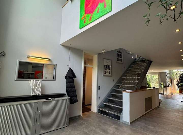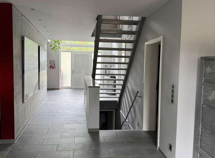 Der Zugang zum Haus erfolgt über einen charmant gestalteten Weg. Die Haustür erreichen Sie über eine kleine Stufe. Hinter der Eingangstür empfängt Sie ein offen gestalteter, hell gefliester Eingangsbereich mit direktem Blick auf die Galerie im Obergeschoss. Die moderne Treppe im Industrial-Stil zieht sofort die Blicke auf sich und setzt einen geschmackvollen Akzent. Zu Ihrer Linken gelangen Sie zu einem kleinen Gäste-WC.