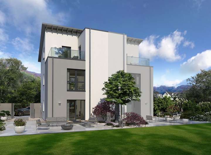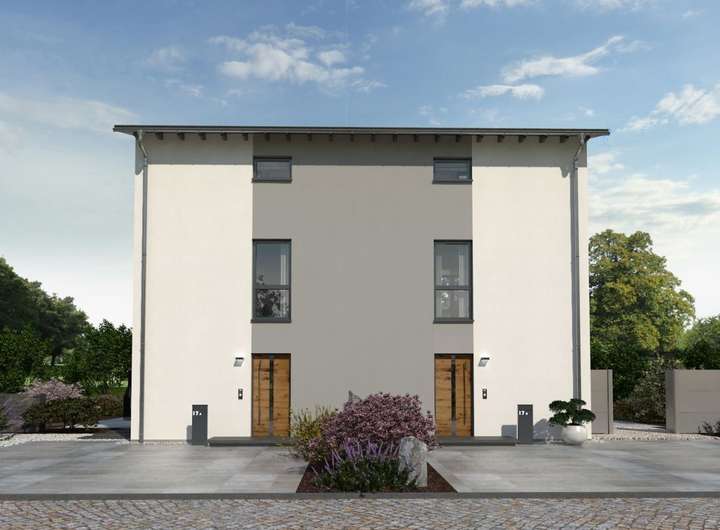 Eine geringe Grundfläche bei maximalem Wohnkomfort - das bietet unser Doppelhaus 08 und eignet sich damit perfekt für kleine Grundstücke. Das dreigeschossige Gebäude mit Pultdach überzeugt nicht nur durch sein durchdachtes Raumkonzept, sondern auch mit einer außergewöhnlichen Architektur, die sich bereits in der Fassadengestaltung zeigt: Durch die symmetrische Bauweise mit einem erkerartigen Vorsprung, der die beiden baugleichen Wohneinheiten optisch voneinander trennt, entstehen im zweiten Obergeschoss sichtgeschützte Balkone, die nach einem anstrengenden Tag zum Relaxen einladen. Ein Ort zum Zusammenkommen, Kochen, Austauschen und Genießen ist das Erdgeschoss mit offenem Wohn-Ess-Koch-Bereich. Zudem im Parterre: HAR, HWR und Gäste-WC. Das erste Obergeschoss ist zugleich das Reich der Kinder: Zwei Zimmer und ein großes Bad stehen hier zur Verfügung. Unter dem Pultdach haben die Eltern ihren Rückzugsort - mit Schlaf- und Arbeitszimmer und direktem Zugang zum Balkon. Mehr Wohnen geht nicht.