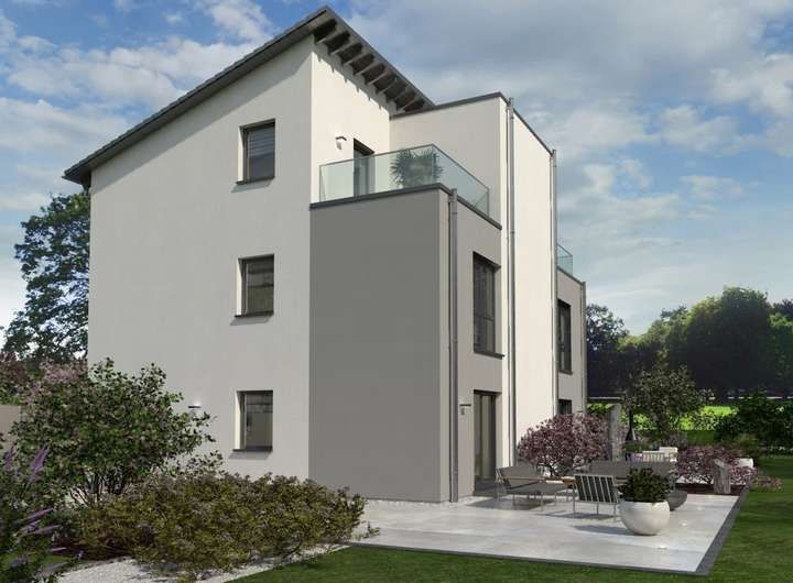 Eine geringe Grundfläche bei maximalem Wohnkomfort - das bietet unser Doppelhaus 08 und eignet sich damit perfekt für kleine Grundstücke. Das dreigeschossige Gebäude mit Pultdach überzeugt nicht nur durch sein durchdachtes Raumkonzept, sondern auch mit einer außergewöhnlichen Architektur, die sich bereits in der Fassadengestaltung zeigt: Durch die symmetrische Bauweise mit einem erkerartigen Vorsprung, der die beiden baugleichen Wohneinheiten optisch voneinander trennt, entstehen im zweiten Obergeschoss sichtgeschützte Balkone, die nach einem anstrengenden Tag zum Relaxen einladen. Ein Ort zum Zusammenkommen, Kochen, Austauschen und Genießen ist das Erdgeschoss mit offenem Wohn-Ess-Koch-Bereich. Zudem im Parterre: HAR, HWR und Gäste-WC. Das erste Obergeschoss ist zugleich das Reich der Kinder: Zwei Zimmer und ein großes Bad stehen hier zur Verfügung. Unter dem Pultdach haben die Eltern ihren Rückzugsort - mit Schlaf- und Arbeitszimmer und direktem Zugang zum Balkon. Mehr Wohnen geht nicht.