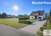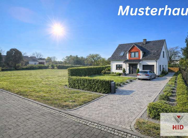 Bei dem gezeigten Hausbild handelt es sich um eine KI-generierte Visualisierung (Musterbild). Dieses dient lediglich als Gestaltungsbeispiel, um die mögliche Bebauung des Grundstücks zu veranschaulichen. Das Grundstück wird ohne Hochbau verkauft.