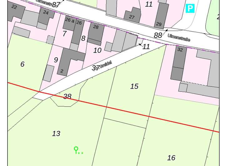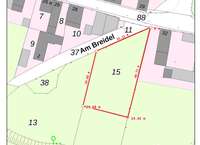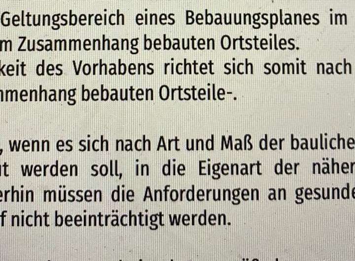 Die Bebauung ist gemäß §34 BauGB (Innenbereich) im Rahmen der bestehenden Nachbarschaftsbebauung möglich. Ein Bebauungsplan liegt nicht vor – entscheidend sind Art und Maß der umliegenden Bebauung. Die zulässige Bautiefe beträgt bis zu ca. 19 Meter.