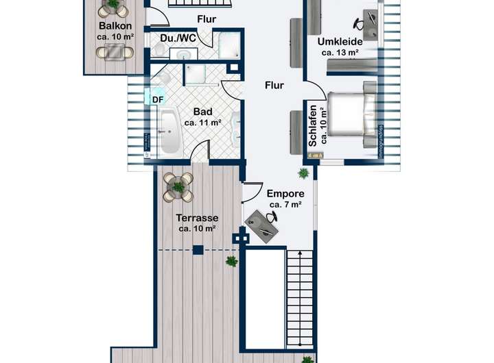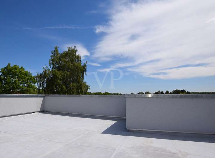 Von hier führt der Weg über die Empore auf die großzügige Dachterrasse – ein echtes Refugium über den Dächern. Ob als private Lounge im Sommer, urbaner Garten oder Ort für entspannte Stunden mit den Liebsten im Freien; ruhig, geschützt und mit Blick ins Grüne.