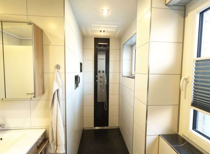- Hauptbad mit Badewanne u. bodengleicher Dusche und Duschpaneel
