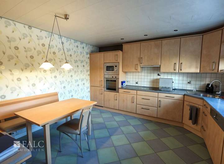 Vom Flur aus geht es weiter in die Küche. Sie ist als klassische Wohnküche angelegt, mit Einbauzeile, viel Arbeitsfläche und Platz für einen Esstisch. Praktisch im Familienalltag: kurze Wege und genügend Stauraum für Vorräte und Küchenhelfer.