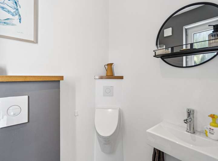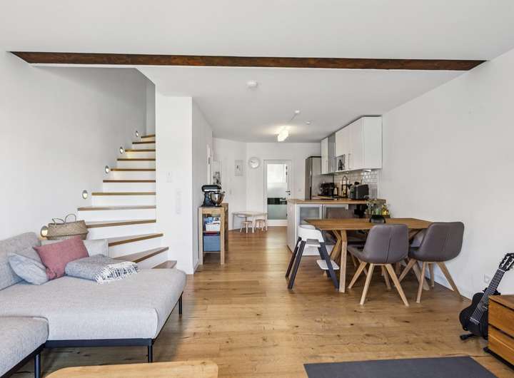 Beim Betreten des Hauses empfängt Sie ein stilvoll gefliester Eingangsbereich, der Platz für eine Garderobe bietet. Ein praktisches Gäste-WC befindet sich ebenfalls im Eingangsbereich. Geradeaus gelangen Sie in den offenen Wohn- und Essbereich mit einer eleganten, weißen Einbauküche. Die großzügigen Fensterfronten sorgen für eine helle und freundliche Atmosphäre. Von hier aus haben Sie direkten Zugang zur Terrasse und dem gepflegten Garten – ideal für entspannte Stunden im Freien.